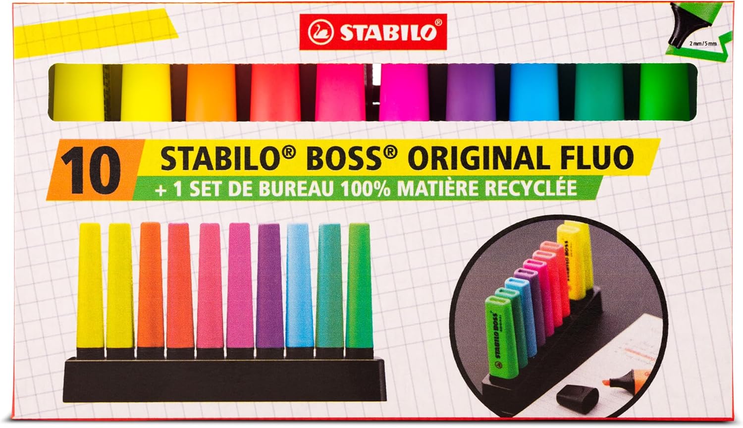 - The STABILO BOSS ORIGINAL is the only highlighter that comes in 9 fluorescent colours to make your work colourful.